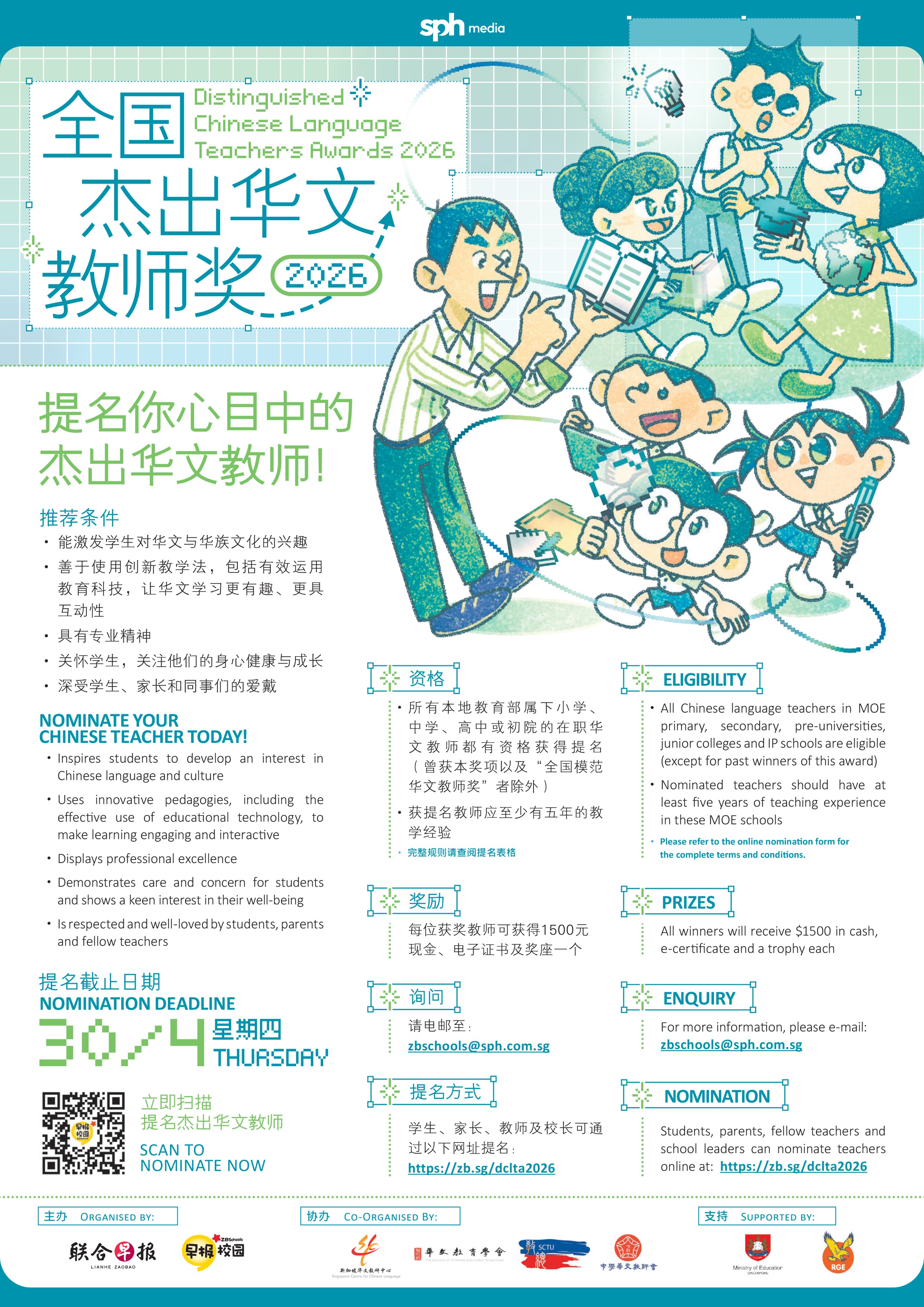 All Chinese Language teachers with at least five years of teaching experience in MOE primary, secondary, pre-university, junior colleges and IP schools are eligible (except for past winners). Students and parents are warmly invited to submit nominations online.